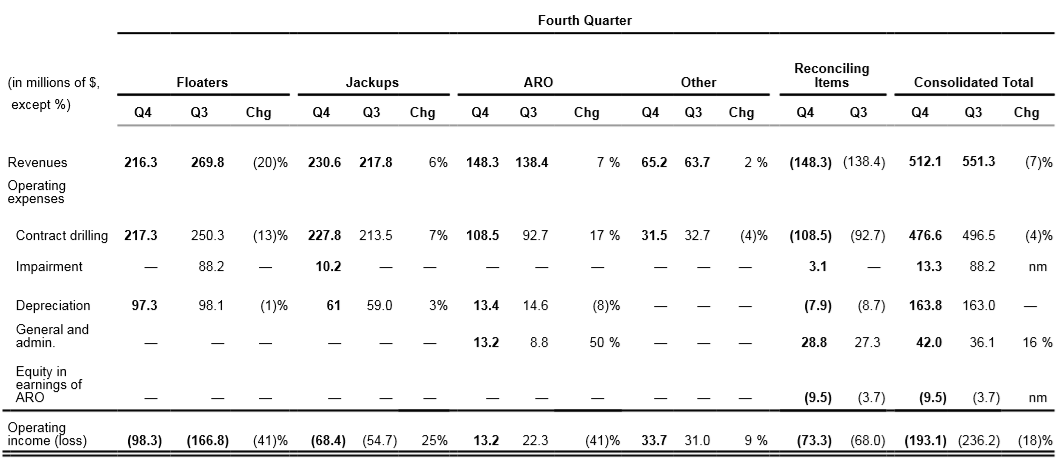 Fourth quarter 2019 results included a non-cash asset impairment charge of $13 million related to VALARIS JU-70, which has been classified as held-for-sale and is expected to be retired from the global drilling fleet, and lease impairment charges for legacy company facilities. Third quarter 2019 results included an $88 million impairment charge related to VALARIS 5006.