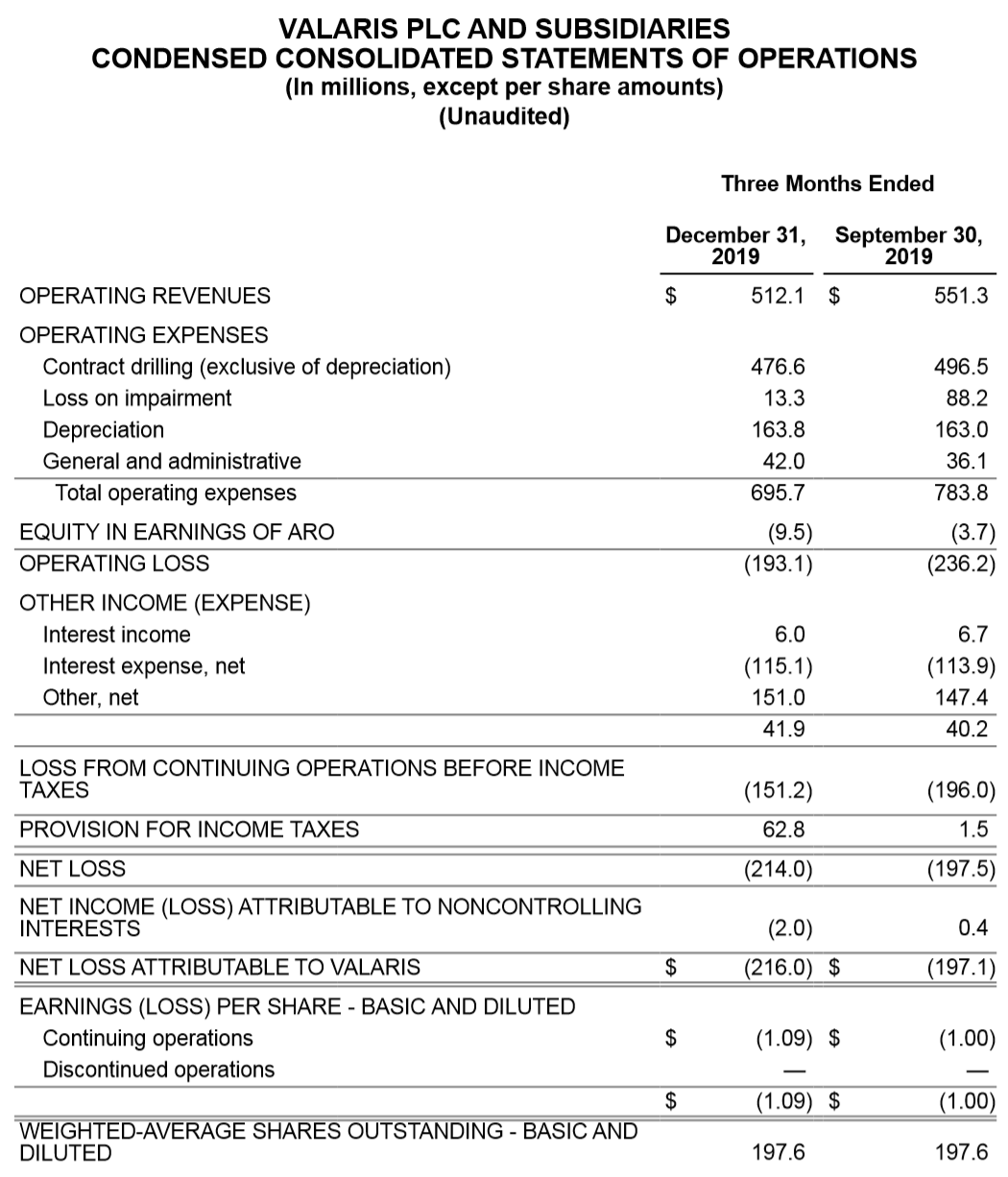 London, England, February 20, 2020 … Valaris plc (NYSE: VAL) (“Valaris” or the “Company”) today reported a net loss attributable to the Company of $216 million, or $1.09 per share, for fourth quarter 2019 compared to a net loss of $197 million, or $1.00 per share, in third quarter 2019. The Company reported adjusted EBITDA of $22 million in fourth quarter 2019 compared to $35 million in third quarter 2019, and an adjusted loss of $1.55 per share in fourth quarter 2019 versus an adjusted loss of $1.27 per share in the prior quarter.