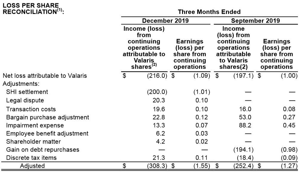 The table below reconciles loss per share, as calculated in accordance with GAAP, to adjusted loss per share for the quarters ended December 31, 2019 and September 30, 2019. Adjusted loss per share excludes the SHI settlement, a legal dispute, transaction costs related to the Valaris merger, bargain purchase gain adjustments, impairment expense, a non-recurring employee benefit adjustment, legal fees associated with a shareholder matter, gain on debt repurchases and discrete tax items. Immediately following the completion of the Valaris merger, every four existing Class A ordinary shares were consolidated into one Class A ordinary share (the "Reverse Stock Split"). All per share data below has been retroactively adjusted to reflect the Reverse Stock Split.