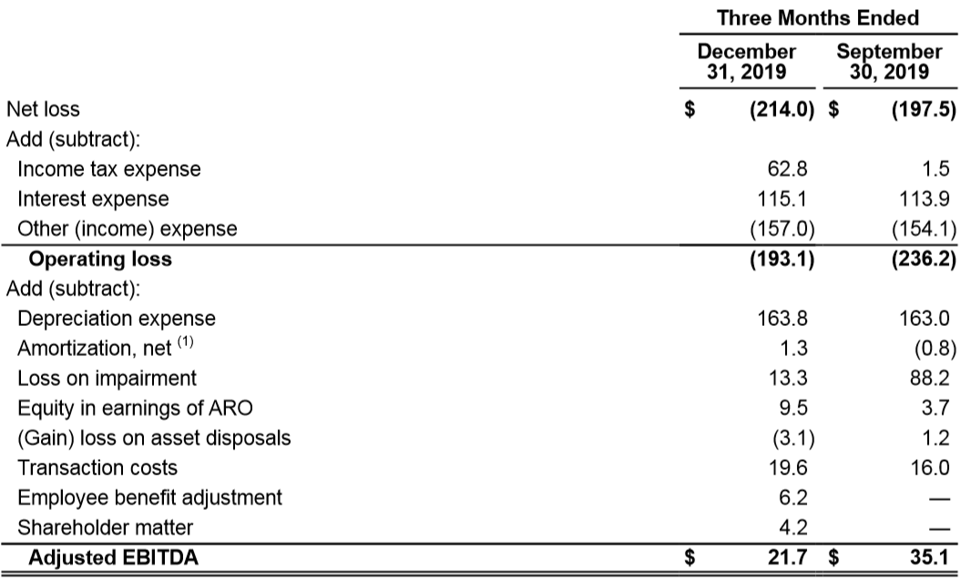 A reconciliation of net loss as reported to Adjusted EBITDA for the quarters ended December 31, 2019 and September 30, 2019 is included in the tables below (in millions):